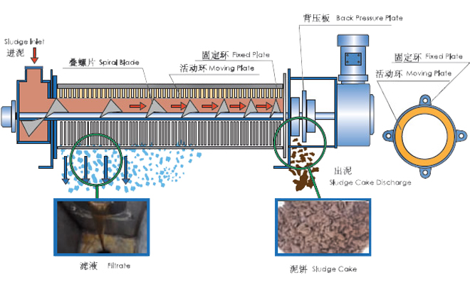 設(shè)備運行時,污泥從進料口進入濾筒后受到螺旋葉片的推送向卸料口移動,由于螺旋軸葉的螺距逐漸縮小,因此污泥所受到的壓力也隨之不斷增加,并在壓力的作用下開始脫水,水從固定環(huán)與游動環(huán)的間隙流出,同時設(shè)備依靠固定環(huán)也游動環(huán)之間的自清洗功能,清掃過濾間隙不易堵塞,泥餅經(jīng)過脫水后在螺旋軸的推進作用下從卸料口排出。